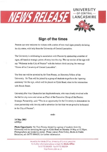 Media and Promotion Office (2003) News release: Sign of the times. Other. University of Central Lancashire (UCLan), Preston.