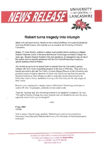 Media and Promotion Office (2003) News release: Robert turns tragedy into triumph. Other. University of Central Lancashire (UCLan), Preston.