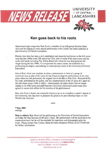 Media and Promotion Office (2003) News release: Ken goes back to his roots. Other. University of Central Lancashire (UCLan), Preston.