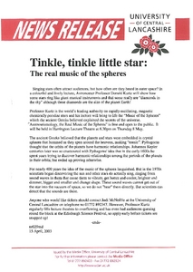 Media and Promotion Office (2003) News release: Tinkle, tinkle little star: The real music of the spheres. Other. University of Central Lancashire (UCLan), Preston.