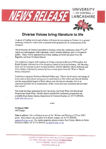 Media and Promotion Office (2003) News release: Diverse Voices bring literature to life. Other. University of Central Lancashire (UCLan), Preston.