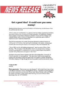 Media and Promotion Office (2003) News release: Got a good idea? It could earn you some money! Other. University of Central Lancashire (UCLan), Preston.