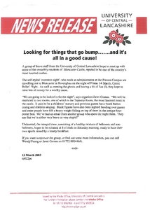 Media and Promotion Office (2003) News release: Looking for things that go bump.......and it's all in a good cause! Other. University of Central Lancashire (UCLan), Preston.