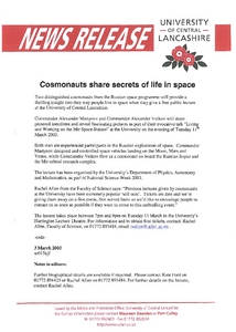 Media and Promotion Office (2003) News release: Cosmonauts share secrets of life in space. Other. University of Central Lancashire (UCLan), Preston.