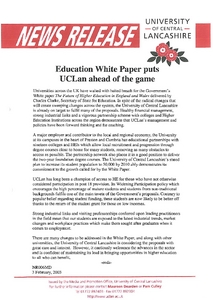 Media and Promotion Office (2003) News release: Education White Paper puts UCLan ahead of the game. Other. University of Central Lancashire (UCLan), Preston.