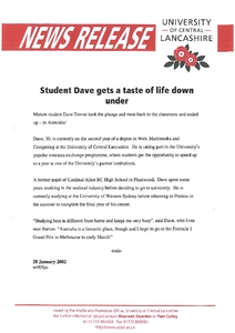Media and Promotion Office (2002) News release: Student Dave gets a taste of life down under. Other. University of Central Lancashire (UCLan), Preston.