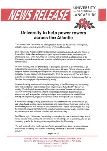 Media and Promotion Office (2003) News release: University to help power rowers across the Atlantic. Other. University of Central Lancashire (UCLan), Preston.