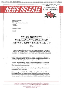 Media and Promotion Office (2001) News release: Never mind the billions...NHS Managers haven't got a clue what to do. Other. University of Central Lancashire (UCLan), Preston.