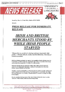 Media and Promotion Office (2001) News release: Irish and British merchants stood by while Irish people starved. Other. University of Central Lancashire (UCLan), Preston.