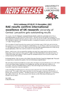 Media and Promotion Office (2001) News release: RAE results confirm international excellence of UK research: University of Central Lancashire gets outstanding results. Other. University of Central Lancashire (UCLan), Preston.