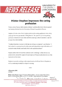 Media and Promotion Office (2001) News release: Printer Stephen impresses the caring profession. Other. University of Central Lancashire (UCLan), Preston.