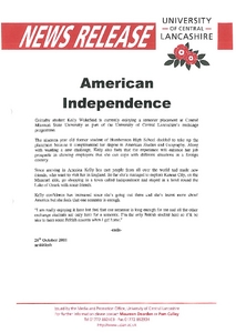 Media and Promotion Office (2001) News release: American Independence. Other. University of Central Lancashire (UCLan), Preston.