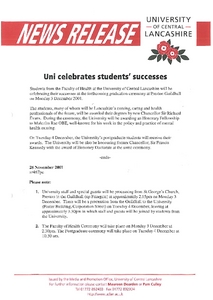 Media and Promotion Office (2001) News release: Uni celebrates students' successes. Other. University of Central Lancashire (UCLan), Preston.
