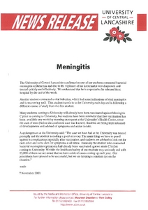 Media and Promotion Office (2001) News release: Meningitis. Other. University of Central Lancashire (UCLan), Preston.