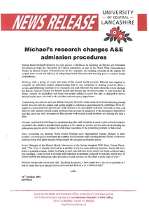 Media and Promotion Office (2001) News release: Michael's research changes A&E admission procedures. Other. University of Central Lancashire (UCLan), Preston.