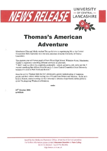 Media and Promotion Office (2001) News release: Thomas's American Adventure. Other. University of Central Lancashire (UCLan), Preston.