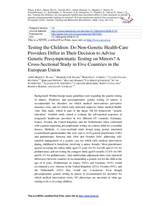 Plass, Anne Marie C., Baars, Marieke J.H., Cornel, Martina C., Julian-Reynier, Claire, Nippert, Irmgard, Harris, Hillary, Kristoffersson, Ulf, Schmidtke, Jörg, Anionwu, Elizabeth N. et al (2009) Testing the Children: Do Non-Genetic Health-Care Providers Differ in Their Decision to Advise Genetic Presymptomatic Testing on Minors? A Cross-Sectional Study in Five Countries in the European Union. Genetic Testing and Molecular Biomarkers, 13 (3). pp. 367-376. ISSN 1945-0265