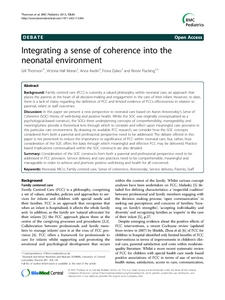 Discussion: In this paper we present a new perspective to neonatal care based on Aaron Antonovksy’s Sense of Coherence (SOC) theory of well-being and positive health. Whilst the SOC was originally conceptualised as a psychological-based construct, the SOCs three underpinning concepts of comprehensibility, manageability and meaningfulness provide a theoretical lens through which to consider and reflect upon meaningful care provision in this particular care environment. By drawing on available FCC research, we consider how the SOC concepts considered from both a parental and professional perspective need to be addressed. The debate offered in this paper is not presented to reduce the importance or significance of FCC within neonatal care, but, rather, how consideration of the SOC offers the basis through which meaningful and effective FCC may be delivered. Practice based implications contextualised within the SOC constructs are also detailed.