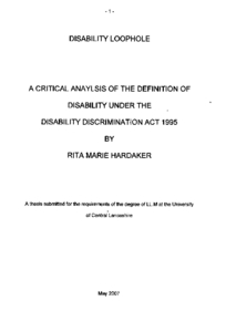 Hardaker, Rita Marie (2007) Disability Loophole a critical analysis of the definition of Disability under the Disability Discrimination Act 1995. Doctoral thesis, University of Central Lancashire.