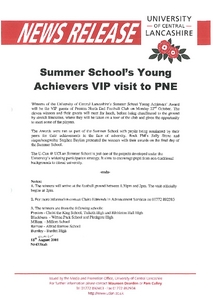 Media and Promotion Office (2001) News release: Summer School's Young Achievers VIP visit to PNE. Other. University of Central Lancashire (UCLan), Preston.