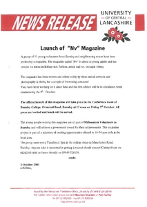 Media and Promotion Office (2001) News release: Launch of "Nv" Magazine. Other. University of Central Lancashire (UCLan), Preston.