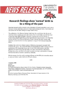 Media and Promotion Office (2001) News release: Research findings show 'normal' birth to be a thing of the past. Other. University of Central Lancashire (UCLan), Preston.