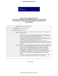 Hunt, Anne and Hacking, Suzanne (2014) "Why does it happen like this?". Consulting with users and providers prior to an evaluation of services for children with life-limiting conditions and their families. Journal of Child Health Care .