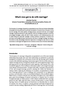 The formation of a marriage is frequently conceptualised as one of the most intimate relationships that people enter into, predicated on particular assumptions of romantic love at the point of entry into the marriage. This article explores marriage practices associated with ‘love’ and ‘arranged’ marriages, frequently presented as polar opposites, with love marriages positioned as normative and arranged marriages as alien and other. It draws attention to non-traditional practices such as online dating and ‘mail-order’ marriages to disrupt dominant assumptions of romantic love and draws some parallels between these practices and those of arranged marriages. By doing so, the article not only acknowledges alternative trajectories to marriage, but also serves as a useful intervention to interrogate the hegemonic Euro-American constructions of intimate relationships.