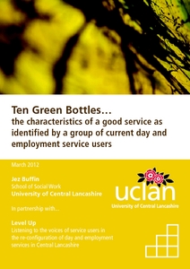 Buffin, Jez (2012) Ten Green Bottles: the characteristics of a good service as identified by a group of current day and employment service users. Project Report. University of Central Lancashire (UCLan), Preston, Lancashire.