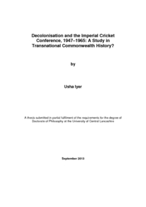 Iyer, Usha (2013) Decolonisation and the Imperial Cricket Conference, 1947-1965: A Study in Transnational Commonwealth History? Doctoral thesis, University of Central Lancashire.