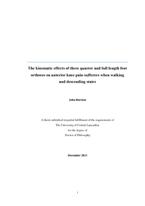 Burston, John (2013) The kinematic effects of three quarter and full length foot orthoses on anterior knee pain sufferers when walking and descending stairs. Doctoral thesis, University of Central Lancashire.