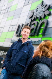 Hopkinson, Karl (2014) Male and female undergraduate studnets in front of Media Factory. [Advancement Image]